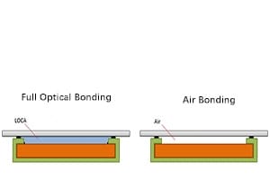 In the production of capacitive touch screen, there are two bonding methods in optional, air bonding and full optical bonding. Following is the contrast.