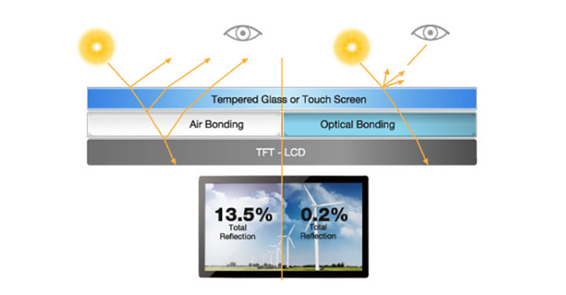 The full optical bonding technology uses water glue or optical glue to completely adhere to the LCD display panel to the touch panel without gaps.
